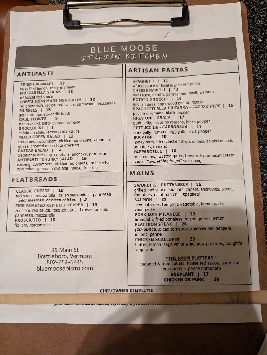 Overall, Blue Moose’s menu offers a blend of traditional Italian flavors with a modern twist, presenting a range of options suitable for all tastes. Whether you're craving something fresh from the land or sea, or perhaps a comforting plate of pasta, this menu ensures there's something to satisfy every palate.